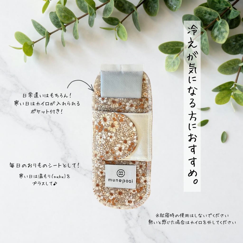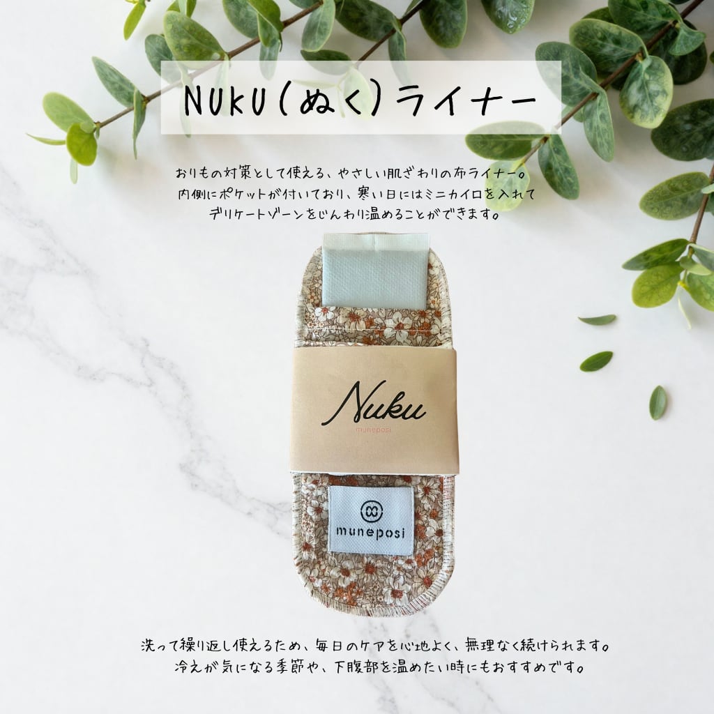 【購入前に必ずお読みください】 布ナプキン(おりもの用) NUKU(ぬく)ライナー おりもの対策として使える、やさしい肌ざわりの布ライナーです。 内側にはポケットが付いており、寒い日にはミニカイロを入れて、 デリケートゾーンをじんわりと温かく包み込むことができます。 ※貼らないタイプのミニカイロがぴったり入ります。 留め具には、肌にやさしいマジックテープを使用。 面で留める仕様のためズレにくく、ショーツの幅に合わせて調整できる設計にしました。 冷えが気になる方や、下腹部まわりを心地よく過ごしたい方に、 ぜひ一度試していただきたいアイテムです。 洗って繰り返し使えるため、毎日のケアを無理なく続けられるのも特徴。 冷えが気になる季節はもちろん、日常のちょっとした「ぬくもりケア」にもおすすめです。 使用上の注意 ・長時間の連続使用はお控えください。 ・低温やけどを防ぐため、カイロ使用時は温かさをこまめに確認してください。 ・熱い・違和感を感じた場合は、すぐに使用を中止してください。 ・就寝時の使用はおやめください。 ・必ず貼らないタイプのミニカイロをご使用ください。 ・お肌に異常を感じた場合は、使用を中止し、必要に応じて専門家へご相談ください。 【色味について】 お使いのモニター設定、および照明等により、実際の商品と色が異なる場合がございます。 また、生地の調達状況により、多少の変更がございます。 1〜5枚までの送料は一律です ・定形外郵便:300円 ・レターパック:500円 ※システムの仕様上、ご注文時に送料が重複して表示される場合があります。 その場合でも、ご購入後にこちらで送料を調整し、正しい金額でご請求いたしますのでご安心ください。