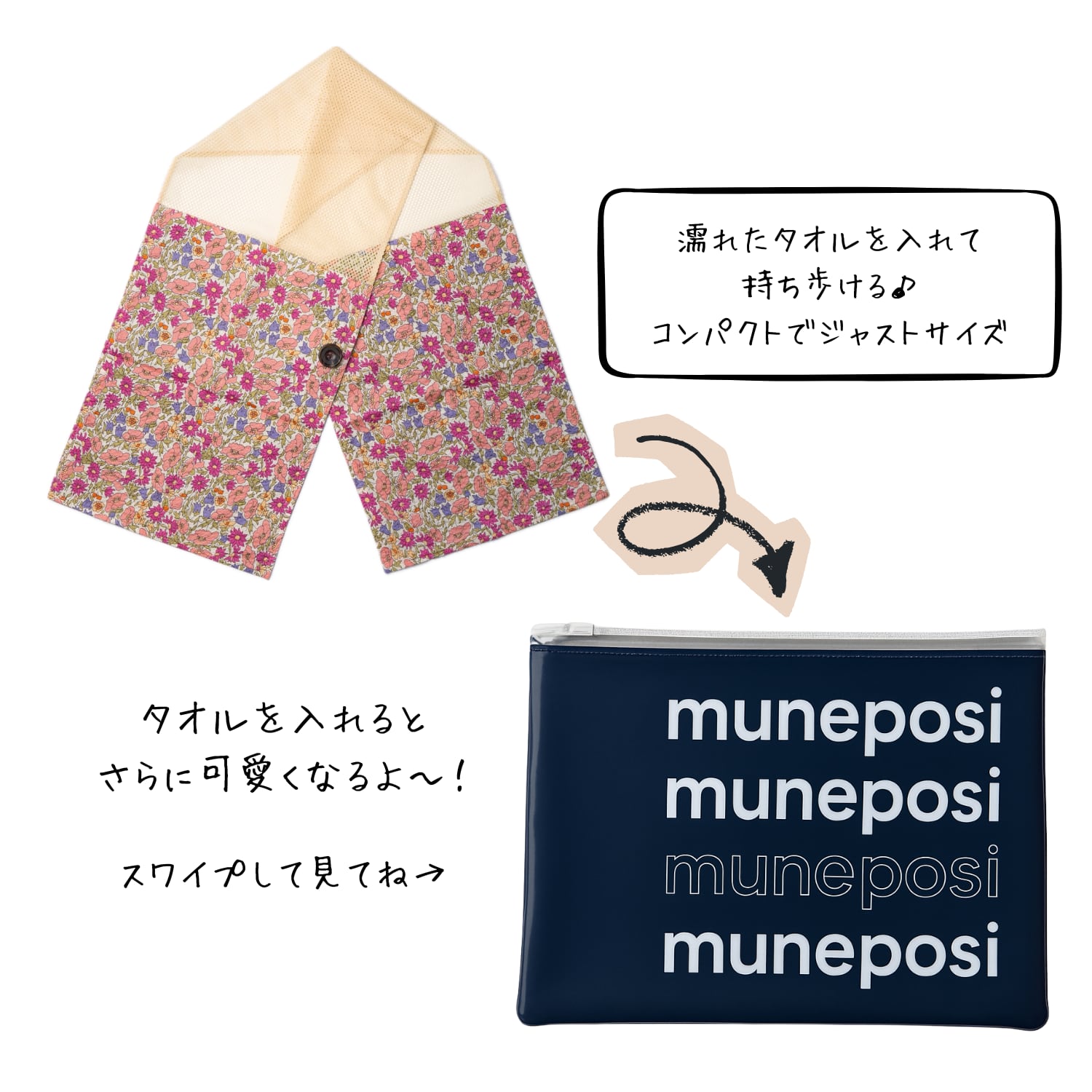 濡れたmuneposiタオルをスマートに収納できる、コンパクトで実用的なポーチです。